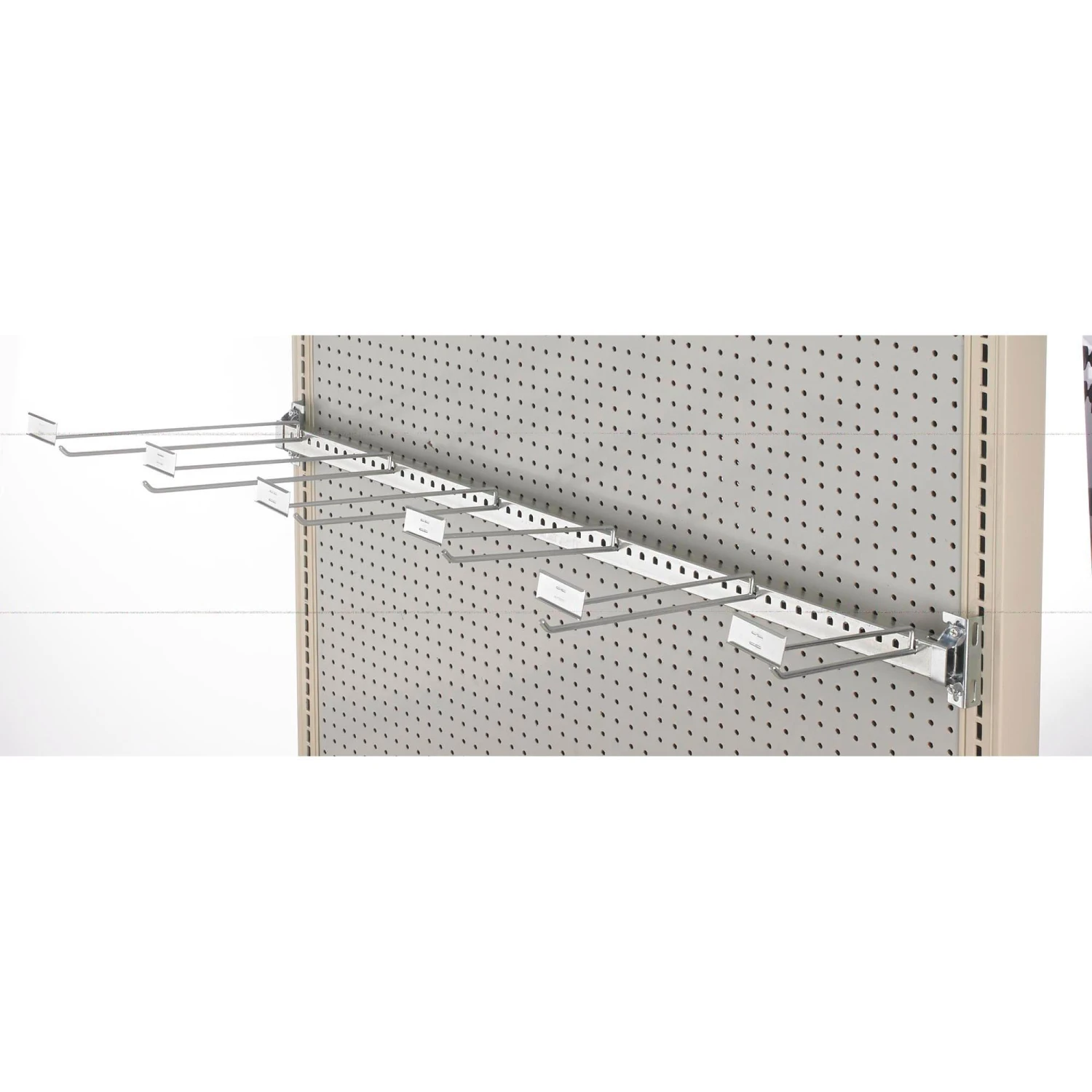 The price plate sits beyond the peg length. There is 15″ of usable space when peg is engaged in bar,