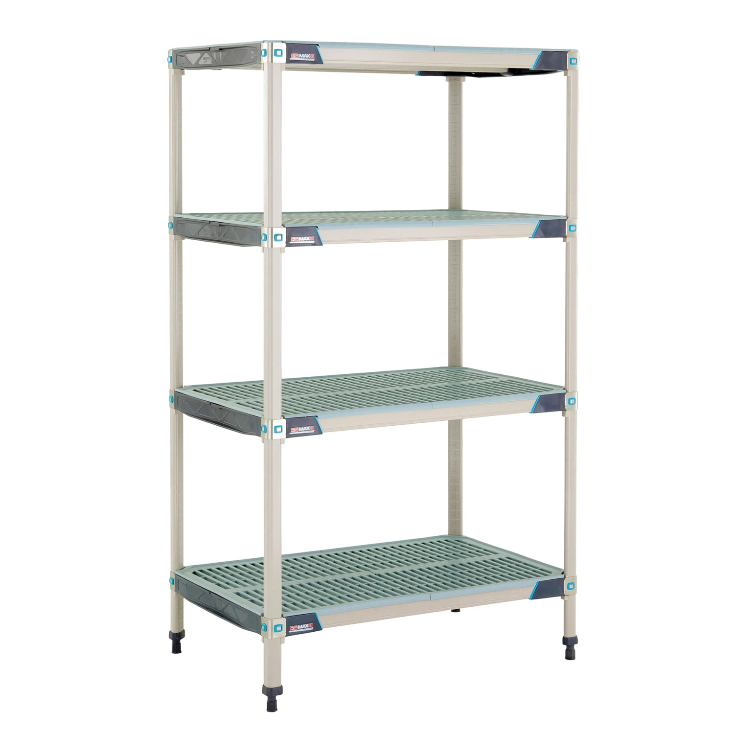 - Includes four open grid shelves and four posts